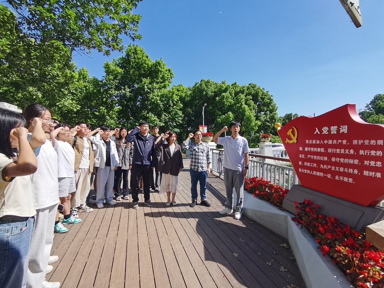 活动伊始,由岳扬同学领誓,部分党员代表重温入党誓词。随后,在党委委员孙永军、给排水专业党支部书记季于峻男、环能专业党支部薛姣的带领下,同学们参观了镜湖文化长廊以及“清廉浦园”广场。长廊分为“知廉”、“尚廉”、“践廉”3个板块,主要展示中国共产党廉洁自律准则、高校教师行为准则、员工行为准则及党历史上的廉洁楷模等,旨在教育师生学廉守廉,自律笃行。