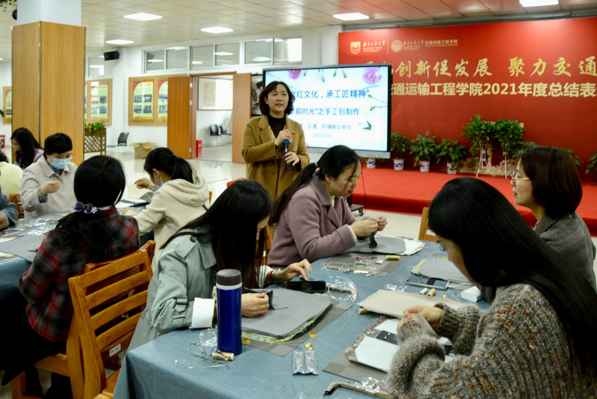 活动伊始,校工会彭亚辉主席致辞,随后城建公司分工会主席陈薇老师介绍手工包起源及其历史和文化,在交通公司分工会主席闵珍老师的指导下,大家饶有兴致的体验手工包的制作工艺,在缝制过程中,大家边学边做边交流,经过2小时的耐心缝制,女教职工们亲手完成了自己的节日礼物,欢声笑语充满整个活动现场。