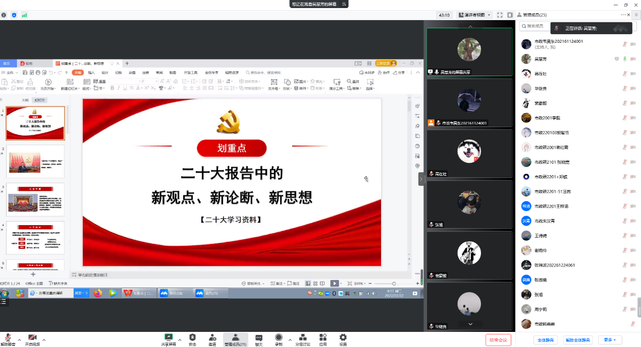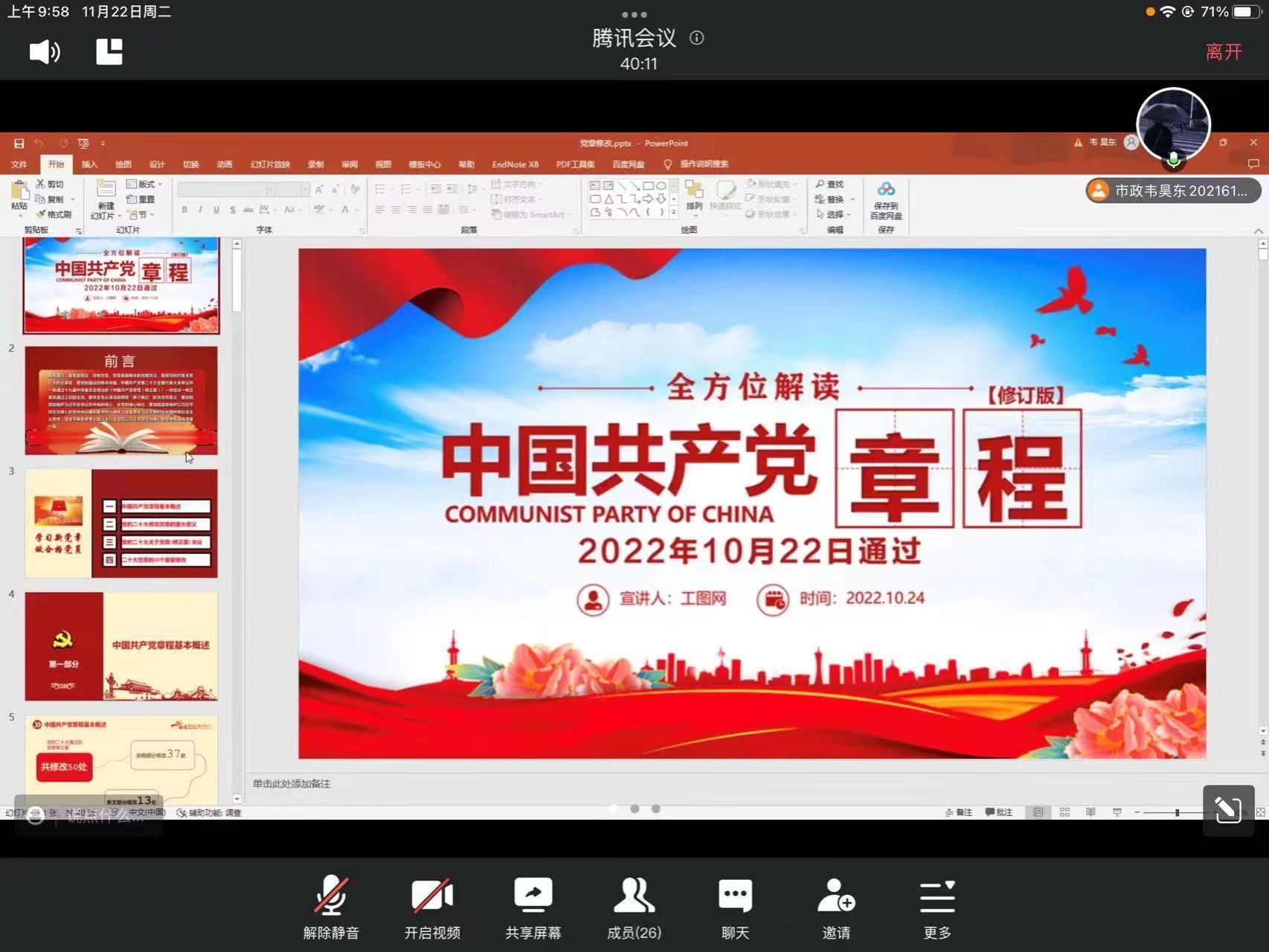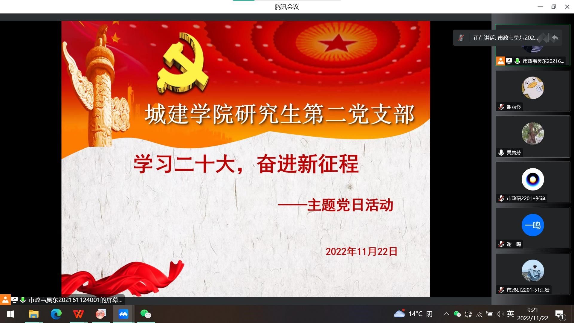 365英国在线体育市政研究生党支部于1122日举行在线会议,学习党的二十大报告和大会通过的《中国共产党章程(修正案)》,激励支部党员增强政治自觉思想自觉行动自觉,把思想和行动统一到党的二十大精神上来。本次活动支部全体党员参加。