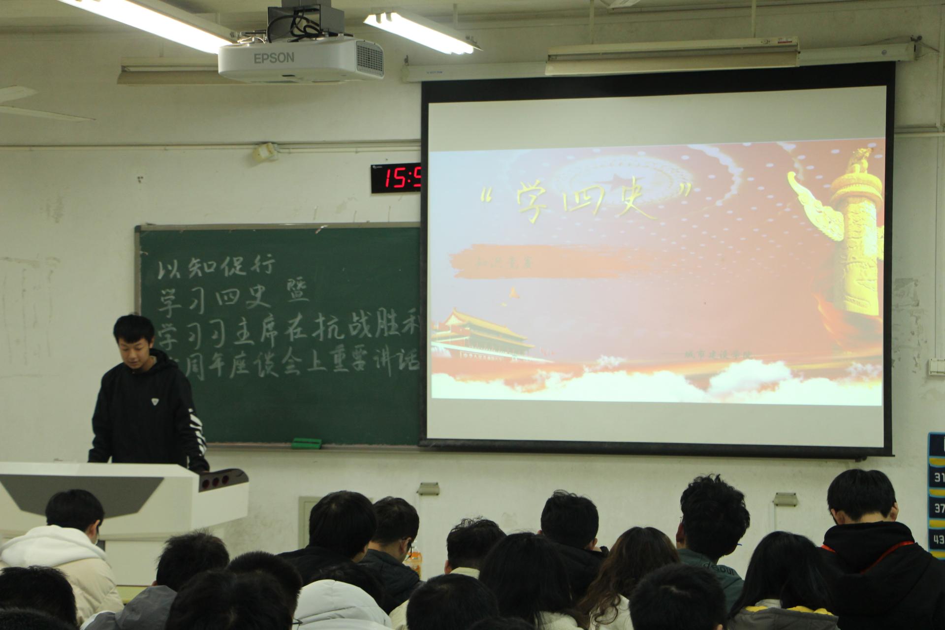 本次活动由两部分组成,首先由主持人放映相关抗战时期视频之后带领大家了解习近平总书记在抗战胜利75周年的重要讲话。之后开始学习四史的知识竞赛问答环节,同学们积极参与,现场气氛高涨。最后,给水2003班的同学获得了此次知识竞赛的第一名。