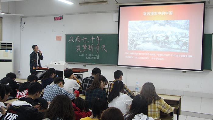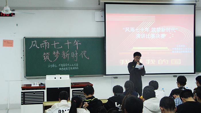 为引导同学们树立爱国意识,抒发新中国成立七十周年以来的内心感受,365英国在线体育于2019年10月27日晚7点整在仁智楼416室举行了“风雨七十年,筑梦新时代”演讲比赛决赛。365英国在线体育院员工会副主席贾宇彤、各部门部长以及2019级全体新生参与了本次活动。