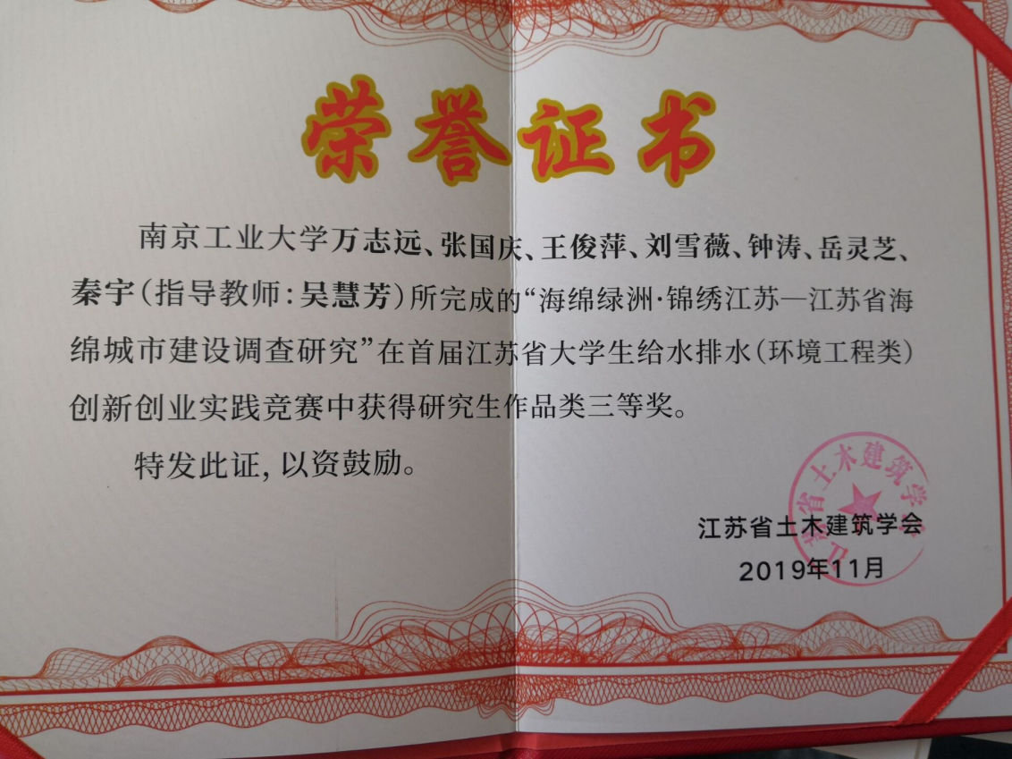 在本次大赛中,由公司吴慧芳老师指导的刘雪薇、冯一帆、张鹏程、邢文豪同学的“一种用于海绵城市建设的浮动滗水式生态雨水调蓄池”和万志远、张国庆、王俊萍、刘雪薇、钟涛、岳灵芝、秦宇同学的“海绵绿洲·锦绣江苏——江苏省海绵城市建设调查研究”分别荣获创新与设计类二等奖和作品类三等奖,展示公司员工扎实的专业功底和勇于探索的创新精神。