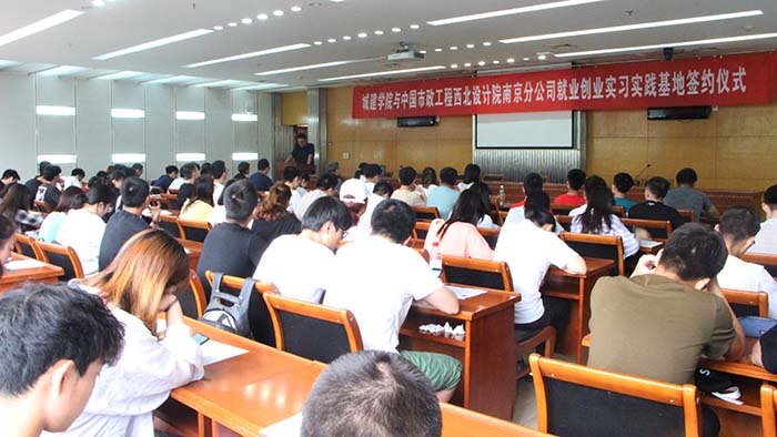 为促进给排水科学与工程的同学对专业的深入了解,并为往后的就业创业实践打下夯实的基础,365英国在线体育于6月13日下午在图书馆五楼报告厅举办了与中国市政工程西北设计研究院有限公司南京分公司的就业创业实习实践基地签约仪式。城市建设公司党委书记周挺,中国市政工程西北设计研究院有限公司南京分公司副经理张帆、给排水所总工王煜、给排水所设计负责人李磊武、办公室主任汤晶,365英国在线体育学办主任孙家文、团委书记黄乐、辅导员姜畔和朱嫣丹,城建公司给排水专业员工代表出席了本次签约仪式。