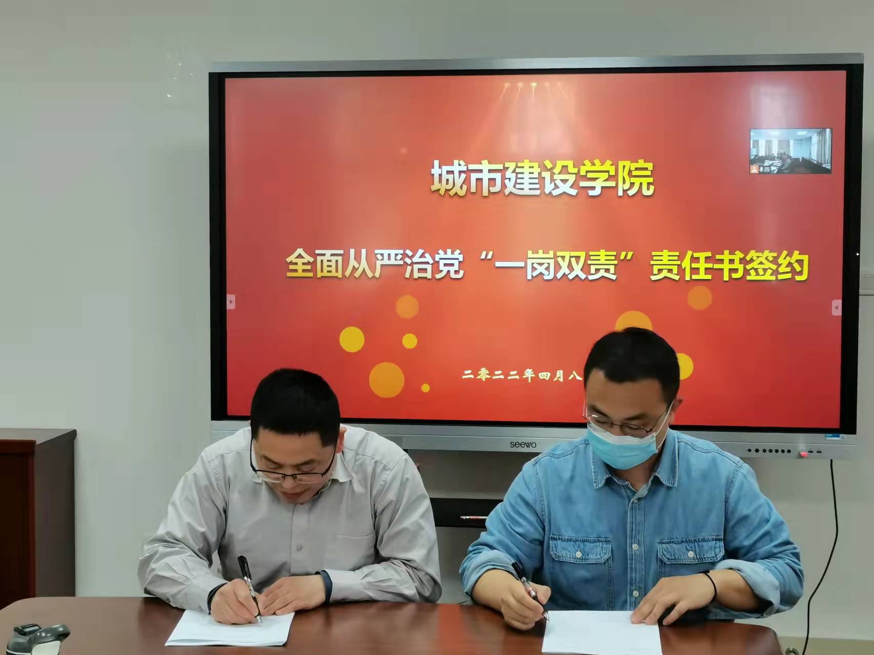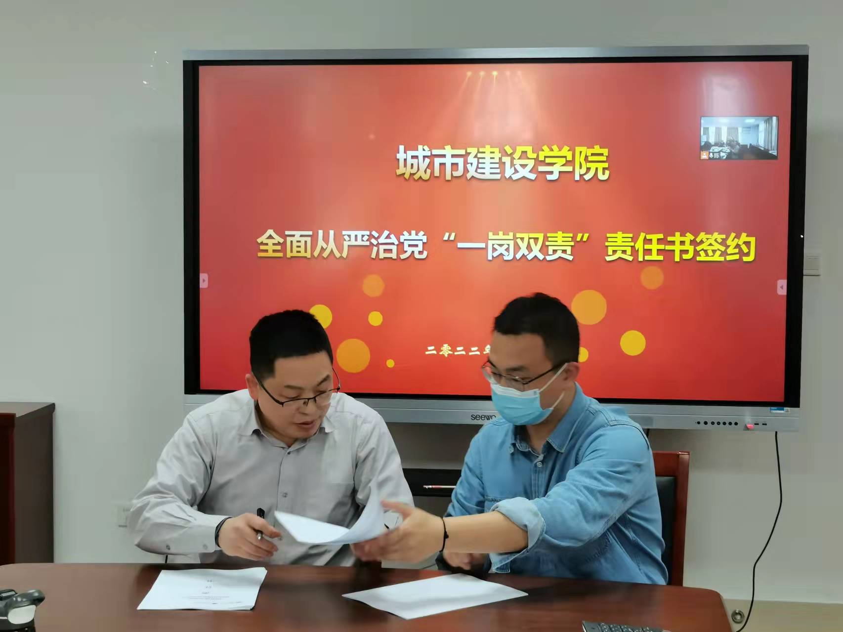 中心组集体学习结束后,公司领导班子通过腾讯会议给全院教职工传达贯彻公司全面从严治党暨警示教育大会精神,并根据全面从严治党“一岗双责”责任网络图签订责任书。