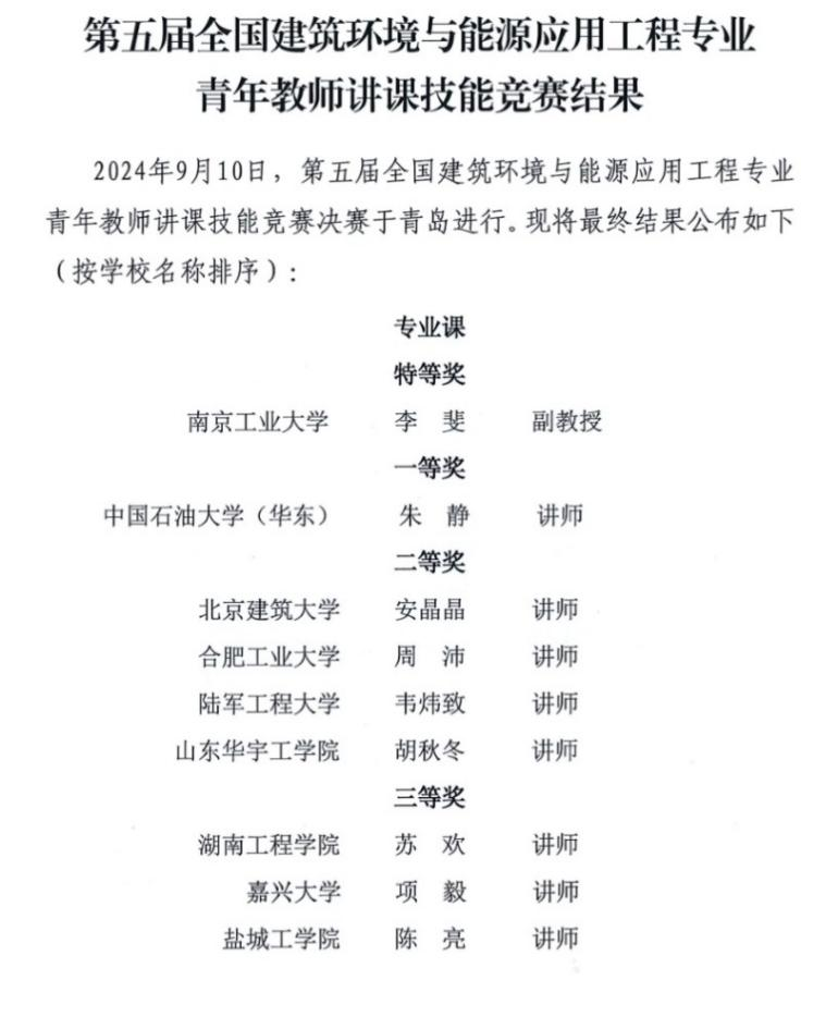 第五届全国建筑环境与能源应用工程专业青年教师讲课技能竞赛决赛于2024年9月10日在青岛圆满完成,李斐老师获专业课唯一特等奖。