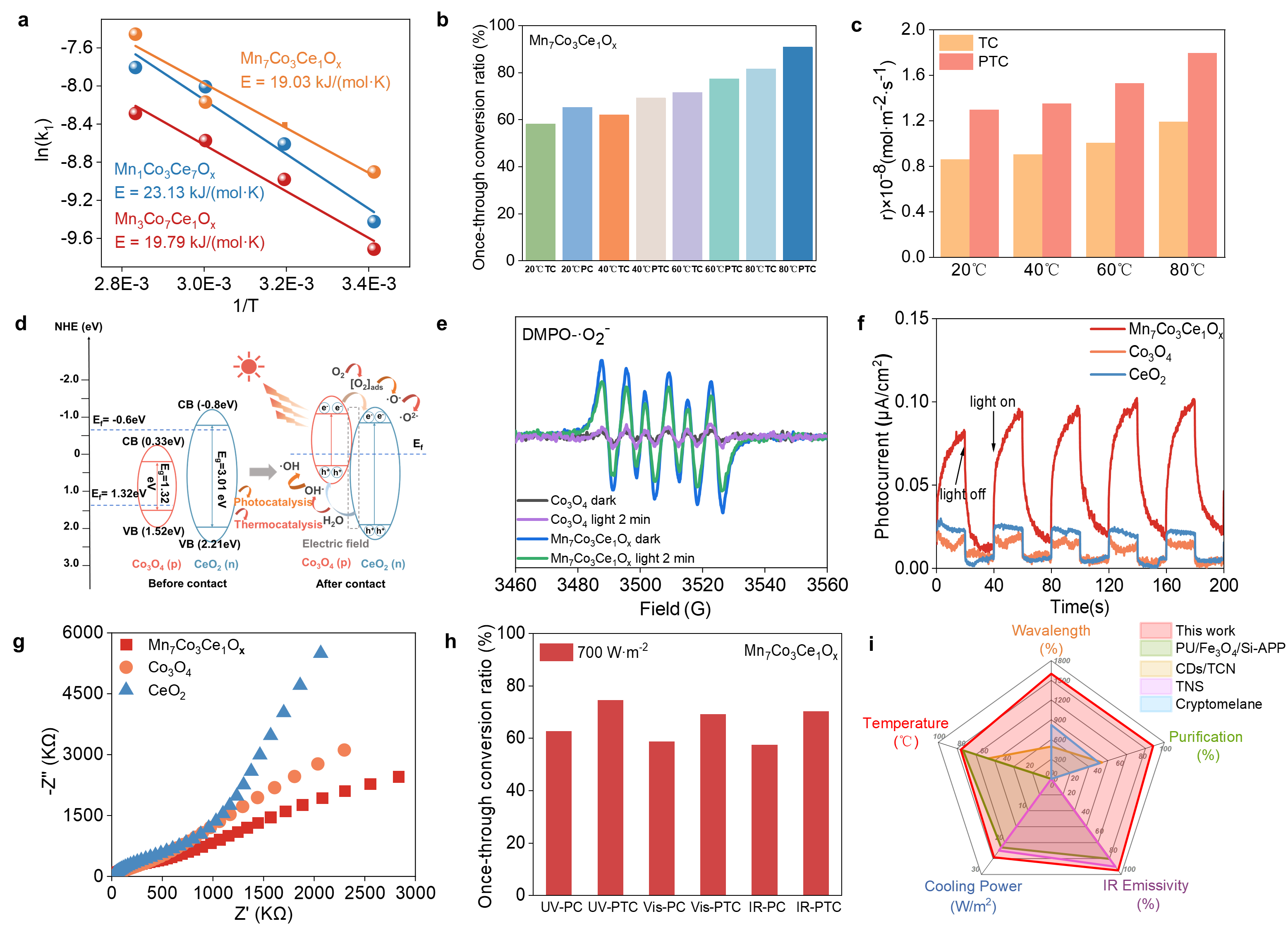 团队开发新型红外光驱动光热催化材料Mn7Co3Ce1Ox,全光谱太阳能吸收率为 94.3%、大气窗口发射率为 95.7%,对室内VOCs去除率达 90.9%,材料具有净化、集热、辐射制冷多重功能。此外结合Mn7Co3Ce1Ox材料、温差发电(TEG)和金属有机框架材料(MOFs),提出PTC-TEG-MOF混合系统,协同利用Mn7Co3Ce1Ox白天集热-催化、夜间辐射制冷效应与MOFs材料白天脱附吸热-夜间除湿放热效应,实现发电、除湿和空气净化功能。结果表明,系统电功率提升 640.1%,室内湿度降低 16.8%,产生干净空气 270.8 m³·h⁻¹·m⁻²。在中国省会城市建筑应用时,年功率为 30-105.3 kW·m⁻²,空调节能为 11.2-353.5 kW·m⁻²,干净空气为 296.3-1119.3 m³·h⁻¹·m⁻²。该成果首次实现以城建公司为第一单位在国际知名综合类期刊上发表文章的突破。